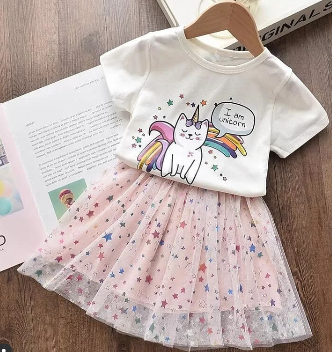Unicorn printing top plus mesh star tutu skirt two-piece dress